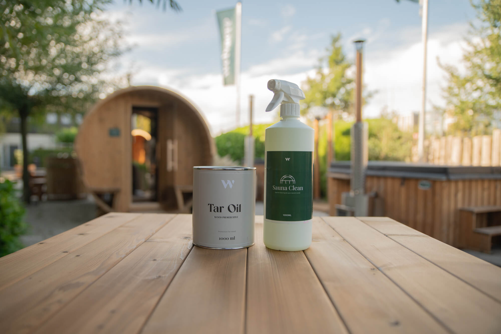 Met Tar Olie bescherm en voed je het hout aan de buitenzijde van de sauna tegen weersinvloeden. SaunaClean is speciaal ontwikkeld voor het veilig en effectief reinigen van het saunahout aan de binnenzijde.